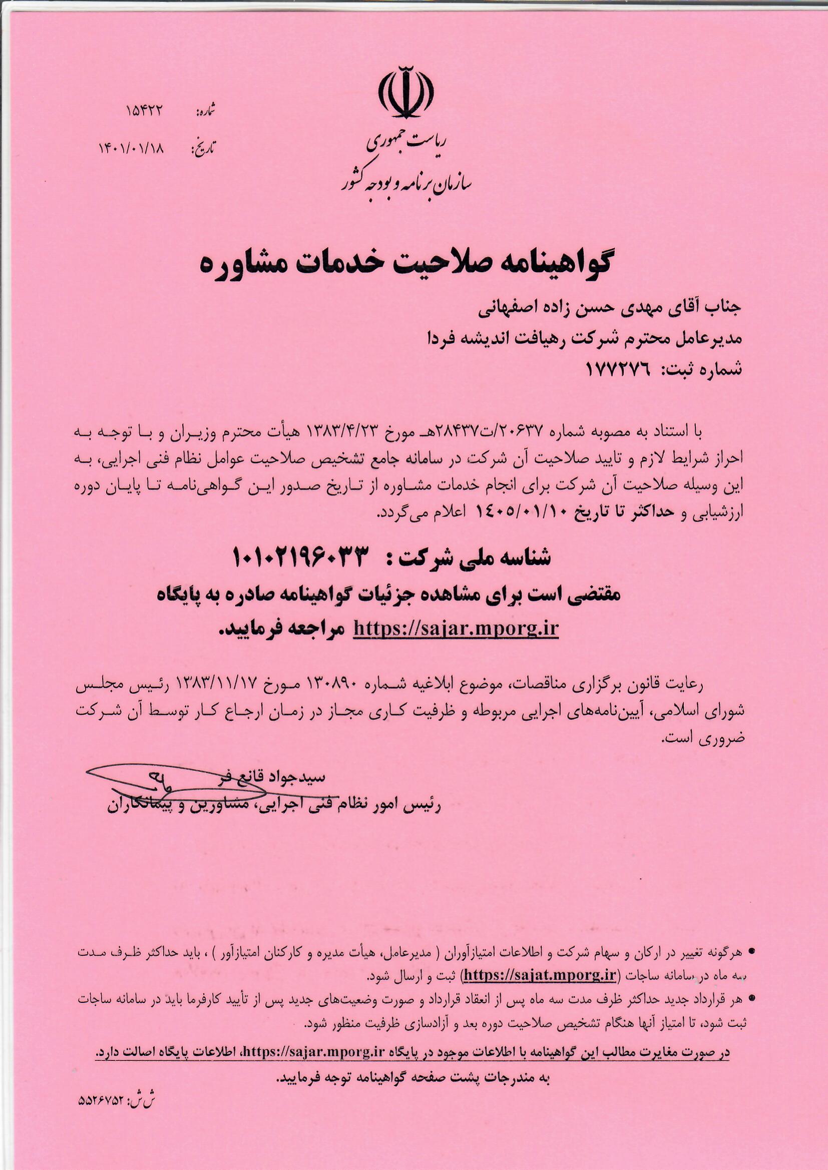 گواهینامه صلاحیت خدمات مشاوره (تخصص)
